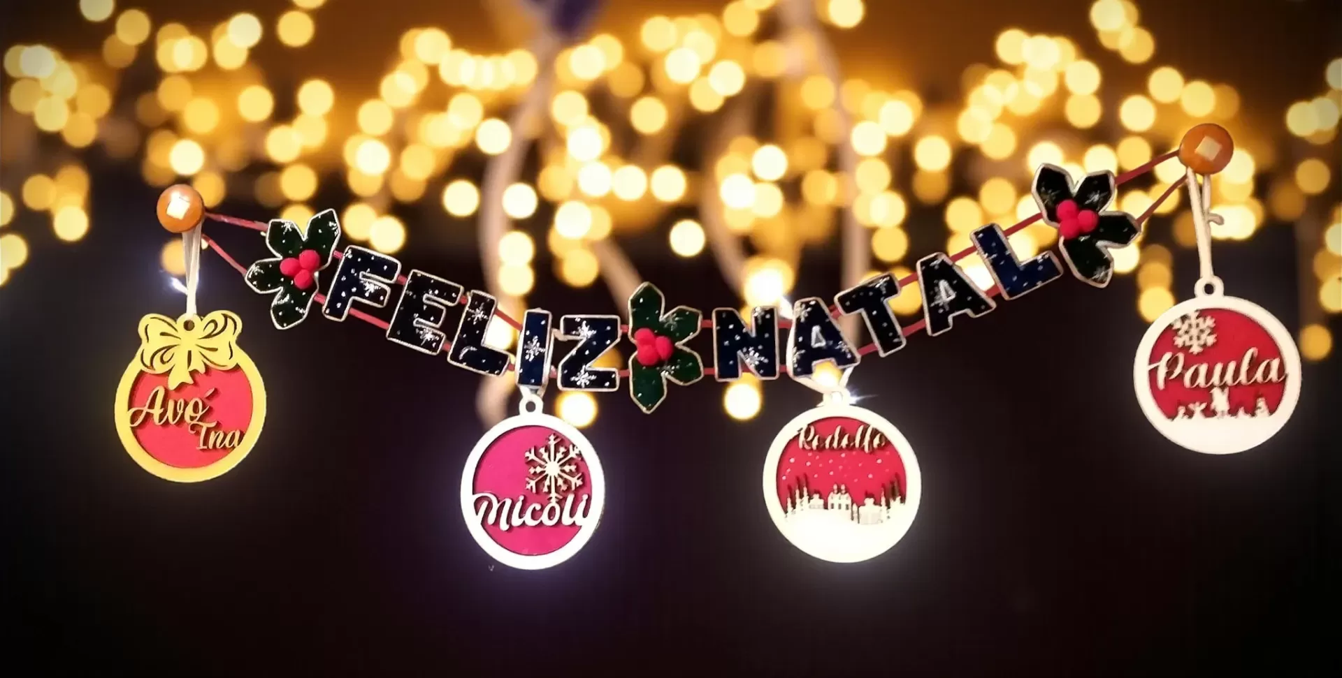 Decoração Coordenada: Criar um conjunto coeso e visualmente apelativo para a sua árvore ou para fazer grinaldas decorativas, como o exemplo do "FELIZ NATAL" suspenso.
