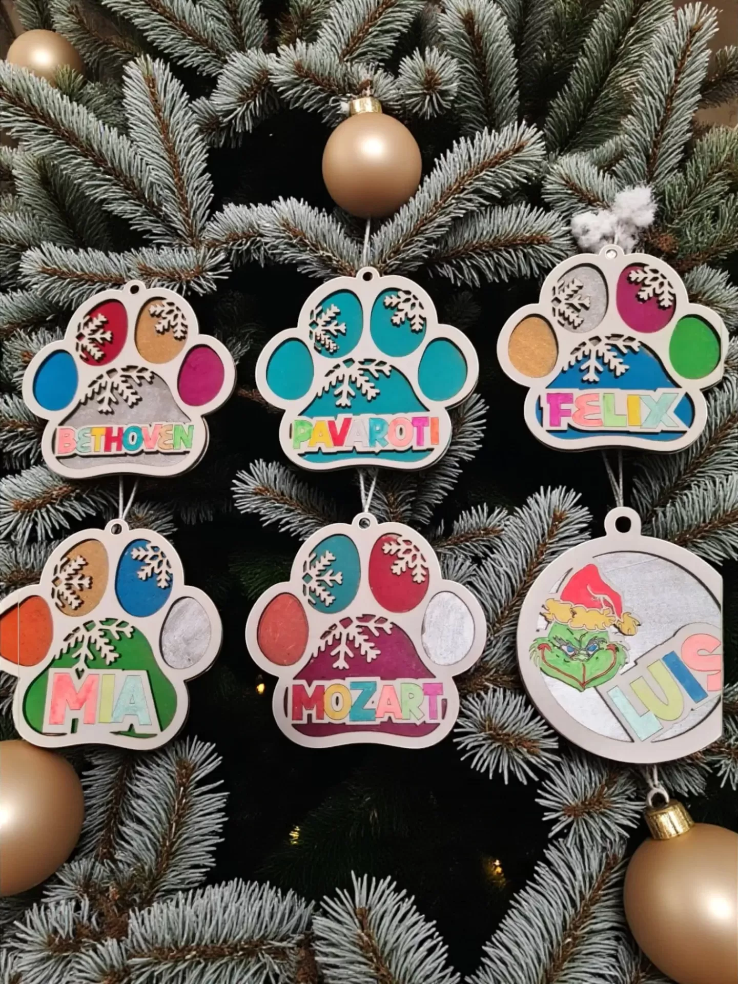 Nomes e Mensagens: A gravação ou recorte do nome é o tipo de personalização mais popular (como ilustram claramente as imagens). Pode incluir os nomes de todos os membros da família, incluindo os animais de estimação (nas adoráveis formas de patinhas, como as mostradas), ou gravar mensagens carinhosas como "Feliz Natal", "O Nosso Primeiro Natal Juntos" ou "O Meu 1º Natal".