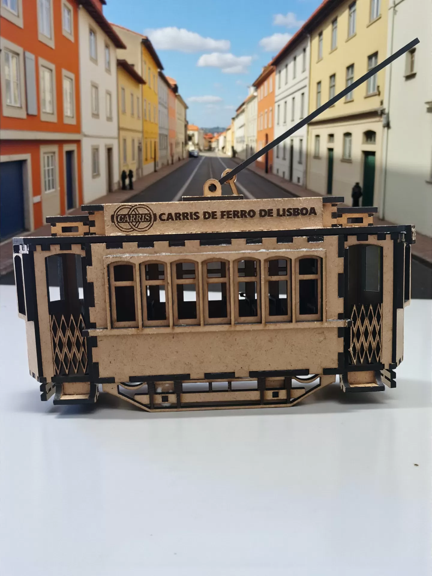 Artesanato de Excelência: Meticulosamente construído em madeira de alta qualidade, este modelo foi feito à mão, capturando a essência e o charme dos carros que serpenteiam as colinas de Alfama à Graça (como se vê na placa indicadora "GRAÇA").