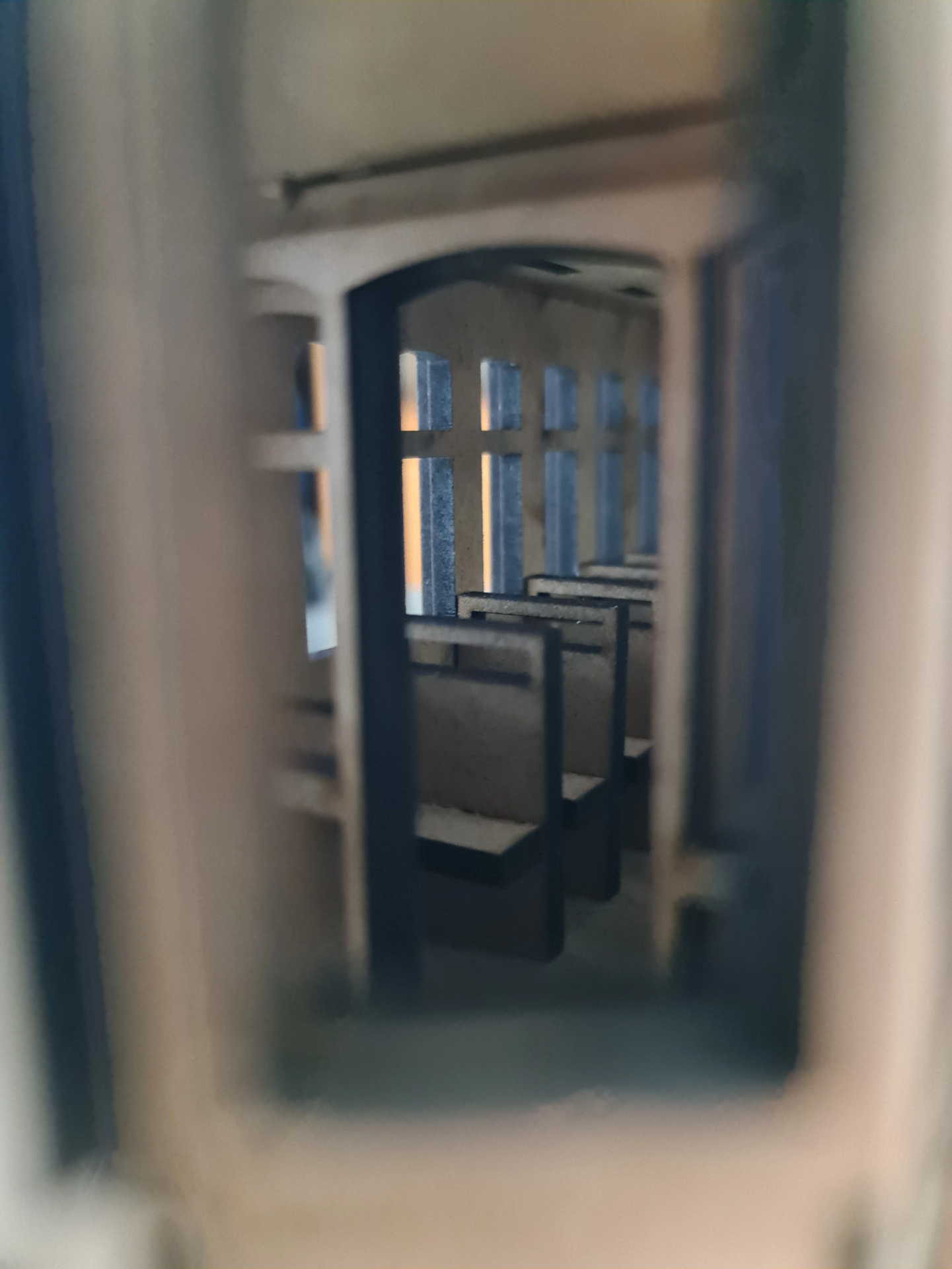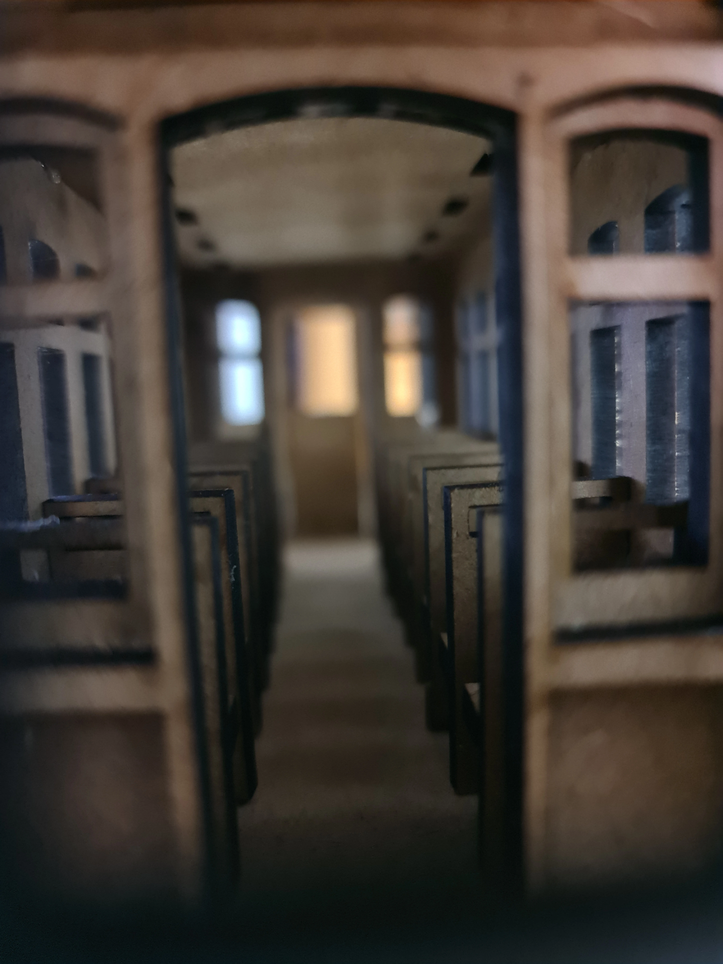 Visão Interior: As fotos mostram o interior detalhado, com bancos e janelas, dando-lhe uma perspetiva única da cabine, tal como o elétrico que transportou gerações de lisboetas.