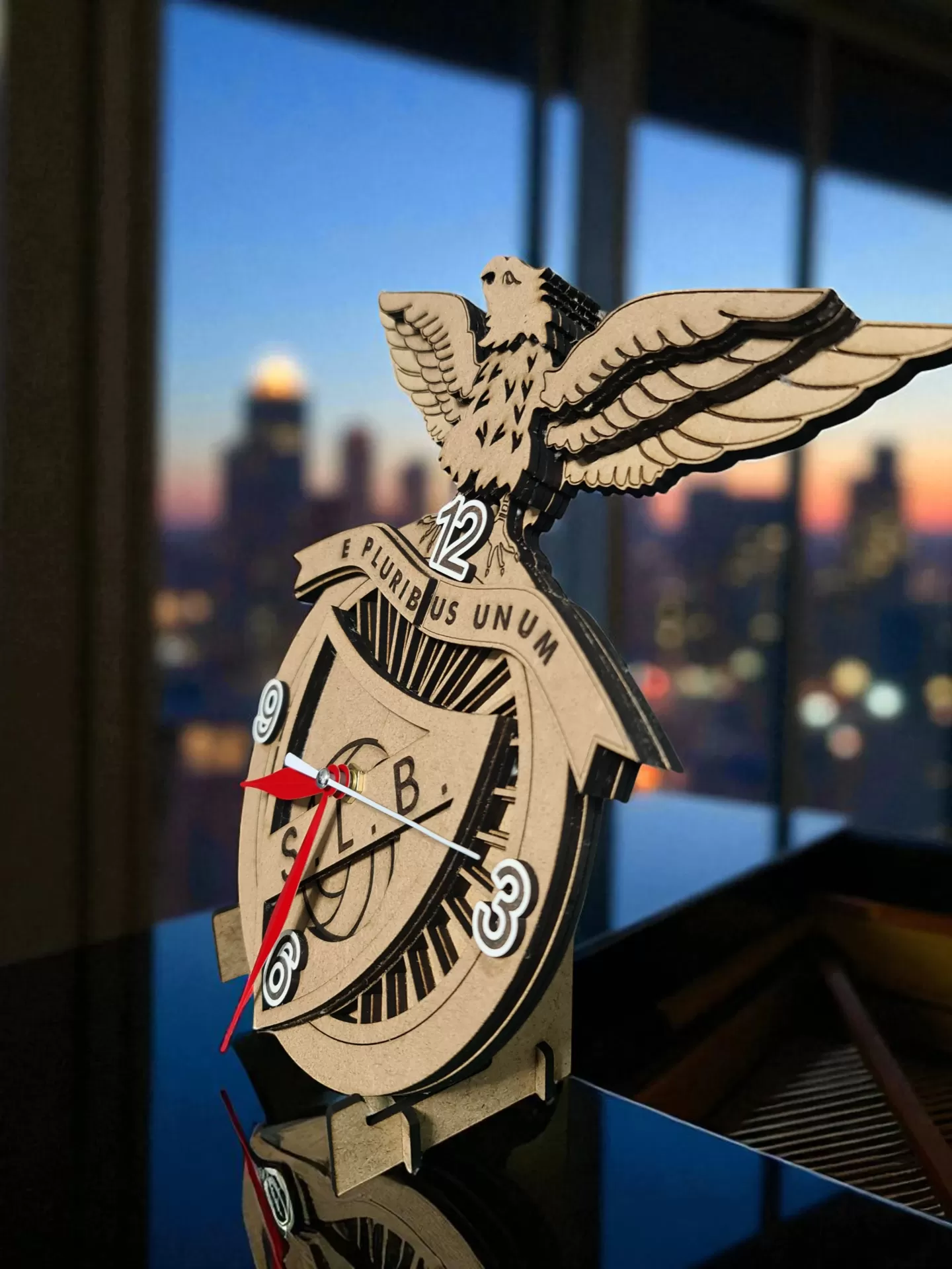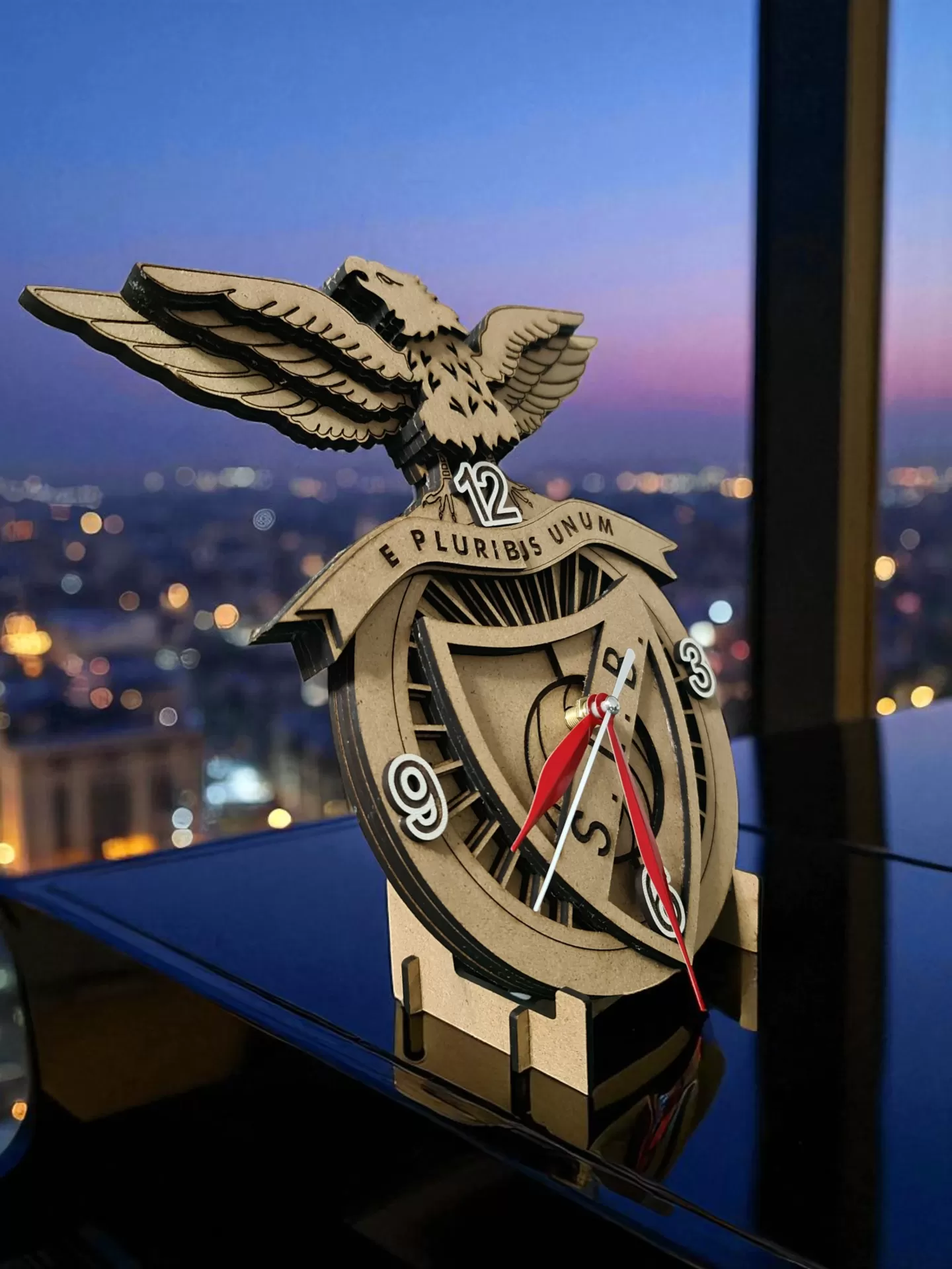 Design de tirar o fôlego: Cada camada de MDF é cortada com precisão a laser, dando vida ao icónico emblema da águia e ao lema "E PLURIBUS UNUM" com uma profundidade e realismo impressionantes.