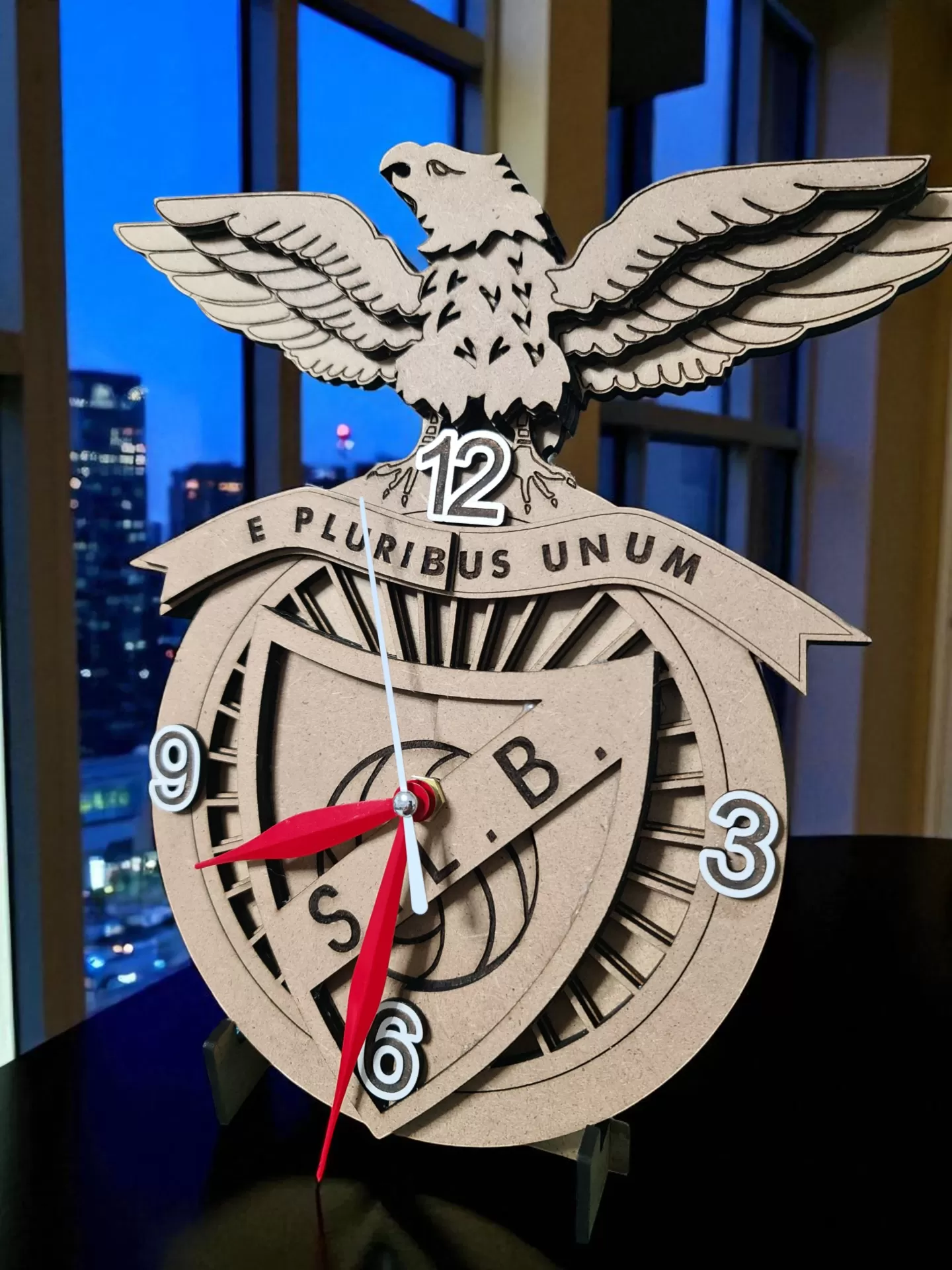Apresentamos o nosso relógio com suporte exclusivo do Benfica, uma peça de arte em camadas de MDF com um efeito 3D que vai deixar qualquer Benfiquista de queixo caído. Mais do que um relógio, é um símbolo do teu amor pelo Glorioso!