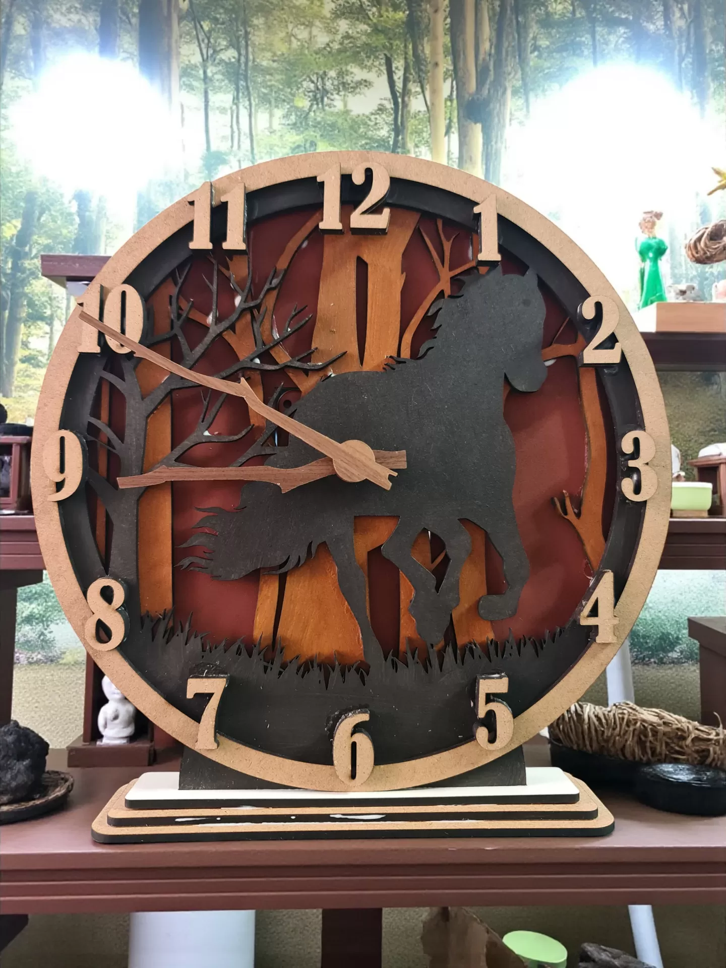 Arte 3D: Criado em madeira MDF e pintado à mão, o design em várias camadas cria um efeito tridimensional hipnotizante, com a silhueta de um cavalo indomável a correr pela floresta.